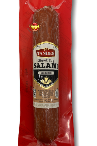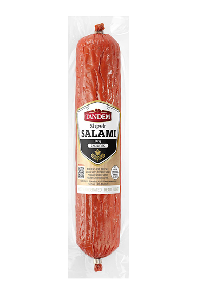 **NEW Larger Size** 1 lb Dry Cooked Shpek Salami Ingredients: pork, beef, salt, natural spices, dextrose, sodium tripolyphosphate, sodium nitrite