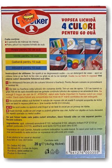 The package contains: red, green, blue, yellow Liquid dye For coloring 10 eggs of each color + 30 red Vopsea Ouâ 4 Culori Pentru 60 oua. 30 oua r...