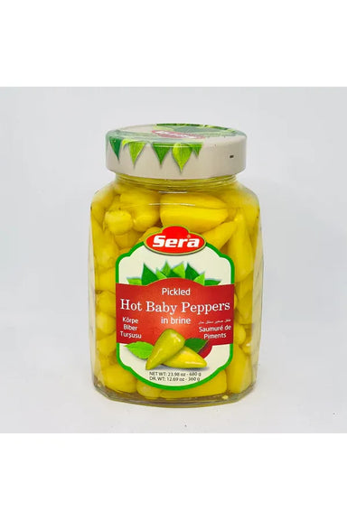 Sera - HOT Baby Peppers in Brine - 680g Ingredients: peppers, water, salt, acidity regulator (acetic acid, citric acid), antioxidant (sodium metabi...